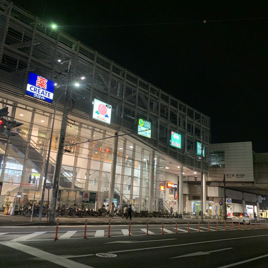 駅前マッサージのある新羽駅前ビル パティオワンは深夜まで営業しており、バーミヤンは深夜2時まで、サイゼリアは深夜0時までの営業です。サイゼリアは同じブルーラインの隣駅である北新横浜駅にも店舗があります。